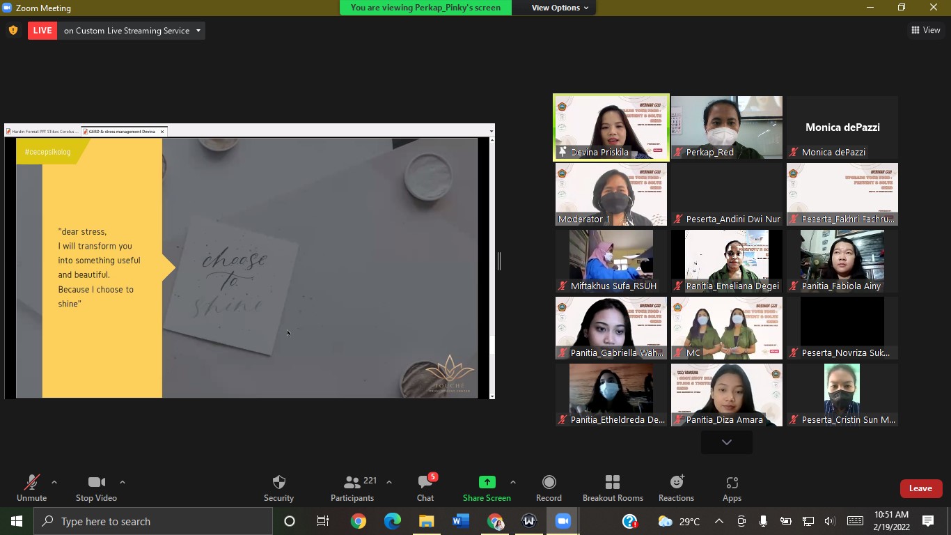 Acara dilanjutkan dengan sesi kedua bersama ibu Devina Priskila Zabrina, S. Psi., M. Psi., Psikolog selaku psikolog klinis dan founder of Touche Development Centre yang akan membawakan materi mengenai pengelolaan stres untuk mengatasi penyakit GERD. Pada sesi ini membahas ap aitu stress dan penyebabnya, mengelola stress yang sehat, aktivitas Pereda stress, GERD stress and anxiety. Moderator pada sesi 1 dan 2 ini dipandu oleh ibu Waisaktini Margaret, S.Gz., Dietisien., M.Gizi yang juga sebagai dosen gizi di STIK SINT Carolus