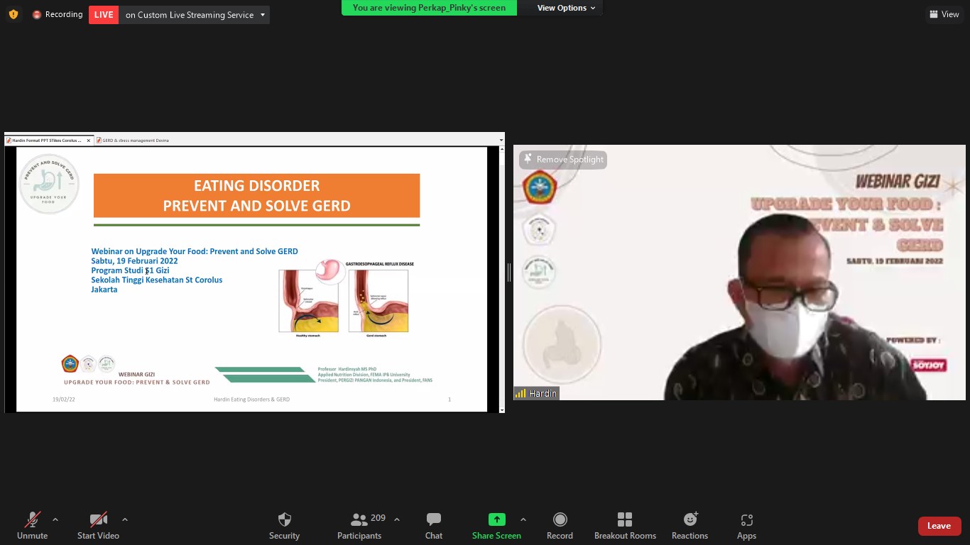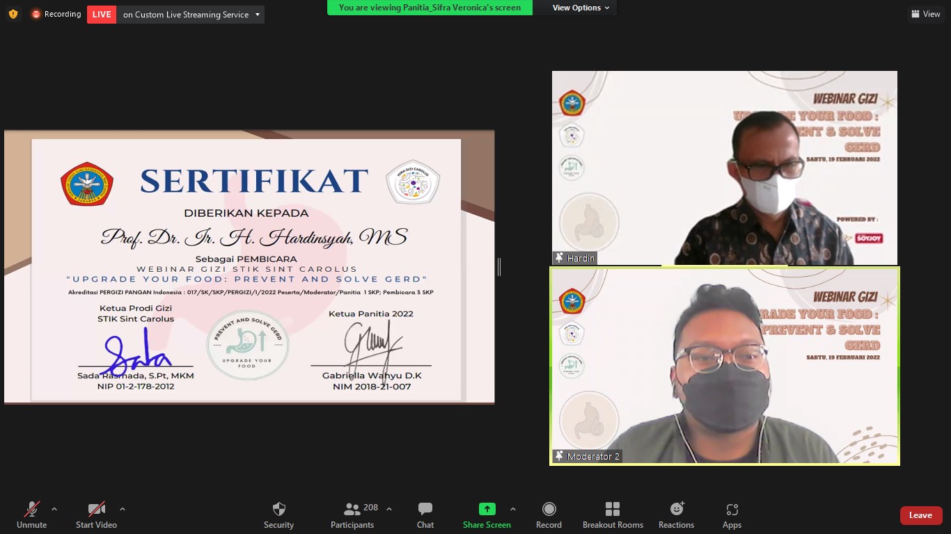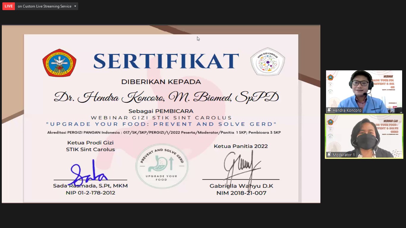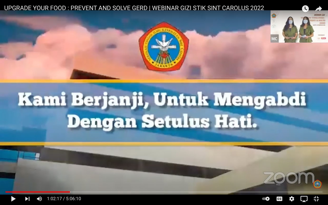 Mahasiswa Semester 7 Program Studi S1 Gizi STIK Sint Carolus menyelenggarakan acara webinar berjudul “Upgrade Your Food : Prevent and Solve GERD”. Acara Webinar ini telah diselenggarakan pada hari Sabtu, 19 Februari 2022.
